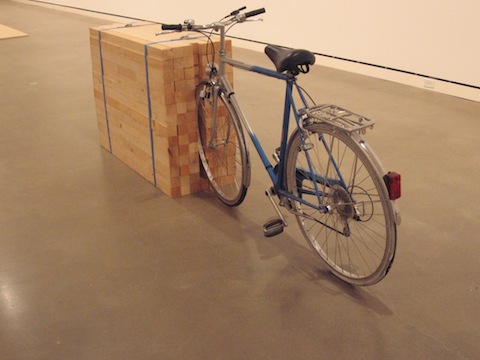 With a break in the music I headed back to the galleries, and became acutely aware of how many of Signer’s pieces seemed to be about potential, with sculptures that either embodied a frozen potential for action, or worked somehow as an index of an action that had already taken place. In Bulletproof Umbrella a red balloon is protected by the titular umbrella, leaving the viewer anxiously awaiting the shot; in Tunnel a gun lies on the ground, pointing through a tunnel created in a rug, with a target on the wall, again pregnant with anticipation. Two of the bicycle works suggest actions that have already taken place. In Bicycle and Wooden Beams the front wheel of a bicycle is lodged in a pile of 2”x2”s, displacing the center beams by a few inches, a futile and pathetic battering ram. Bicycle with Yellow Ribbon consists of a wooden shipping crate (the perfect size for a bicycle), wrapped in a yellow ribbon, which connects to a spool attached to the rear of a bicycle leaning on its kickstand nearby. This immediately brings to mind the image of Signer riding his bicycle around its crate, somehow capturing its captor, as well as the effort and costs of the journey the bike took from Switzerland. In the two pieces each entitled Wheel, potential is frozen in place. In the earlier iteration a bicycle wheel is lodged in cement, absurd and useless. In the more recent version, a wheel is lodged in a brick of ice, kept inside a freezer. The wheel is locked in place, it s potential for movement stalled, but only temporarily, as the ice may melt leaving the wheel free to fall or roll.