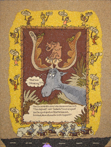 This year the trend continued, perhaps with even more urgency. I have to assume the RNC convention just a couple of miles from the exhibit hall may have something to do with this. Certainly it added to the impact of these crop art protests. Kim Cope’s anti-Norm Coleman piece was the most specific, depicting Norm’s head on a bowling pin in the midst of being explosively knocked down by a ball, with the punny inscription “’Spare’ us from ‘the Norm.’” (A nice added touch – the scoring box above displays a “turkey,” letting us know that this bowler has rolled three strikes in a row, presumably with the “Norm” pin going flying each time). The other pieces shared a couple of themes: elephants and their droppings. Paul Weig’s was perhaps the most overt, even labeling his elephant “GOP” as it squats to defecate on a pile of papers marked “Constitution,” “Bill of Rights,” “Climate Change,” “Human Rights,” etc. A second Kim Cope piece used a similar metaphor, depicting a shovel-wielding Barack Obama following a group of elephants as they head back to a big top tent, saying “Too bad we’re stuck cleaning up their messes!” as he scoops up piles labeled “gas prices,” “US debt,” “falling bridges,” “mortgage crisis,” “gitmo” and Iraq war.” Teresa Anderson’s entry made use of the same metaphor, depicting a line of elephants walking off a cliff, labeled “W,” “McSame,” “Norm” and “Tim,” with text above stating “Cleaning up after the elephants is the dirtiest job in the circus.” The most complex of the elephant referencing pieces was surely Laura Melnick’s elaborate Dr. Seuss riff, with Thidwick the Big-Hearted Moose supporting an elephant in his antlers, with a thought bubble declaiming, “what was I thinking?” Below the portrait was some Seuss-y text:Then he dozed off to sleep in his fine moose-hair nest.